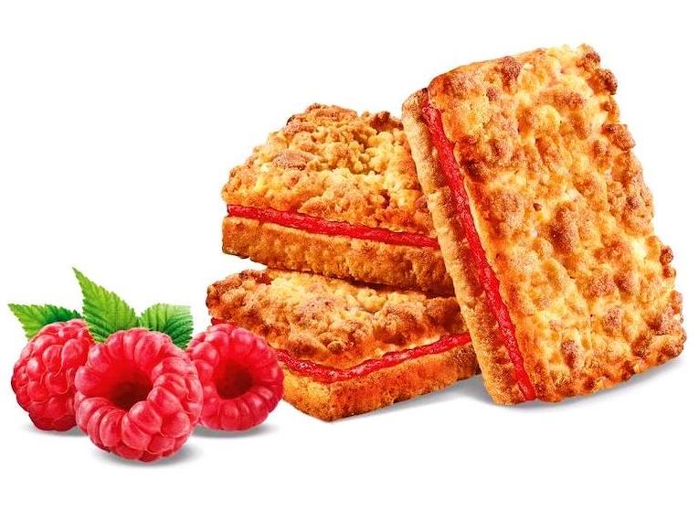 Прямоугольное сдобное печенье с большим количеством малинового джема (около 40% веса печенья)