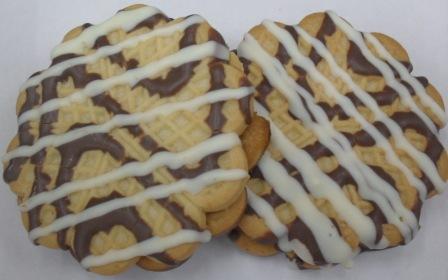 Сахарное печенье, две половинки склеены джемом, декорировано белым и черным шоколадом