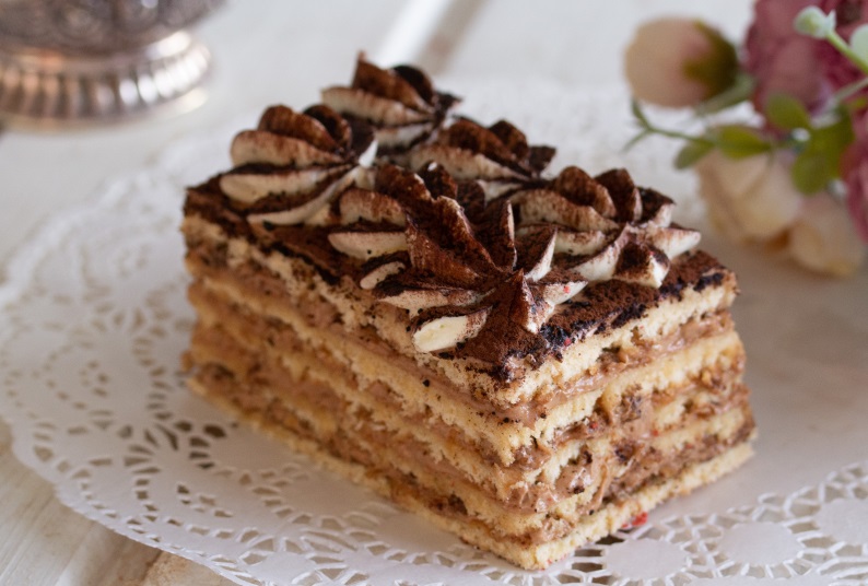 Пирожное из тончайших коржей с ароматом «тоффи», сливочный крем с добавлением шоколадно-ореховой пасты и пропиткой коржей сиропом с добавлением вина и дробленным жаренным арахисом